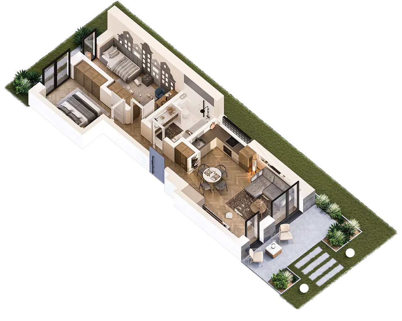 Osiedle składa się z sześciu kameralnych budynków wielorodzinnych, w których znajdziesz mieszkania dopasowane do różnych potrzeb. W ofercie dostępne są przestronne mieszkania parterowe z ogrodami oraz nowoczesne mieszkania na piętrze z balkonami. Wszystkie lokale sprzedawane są w standardzie deweloperskim, z instalacją ogrzewania podłogowego i indywidualnymi piecami gazowymi.